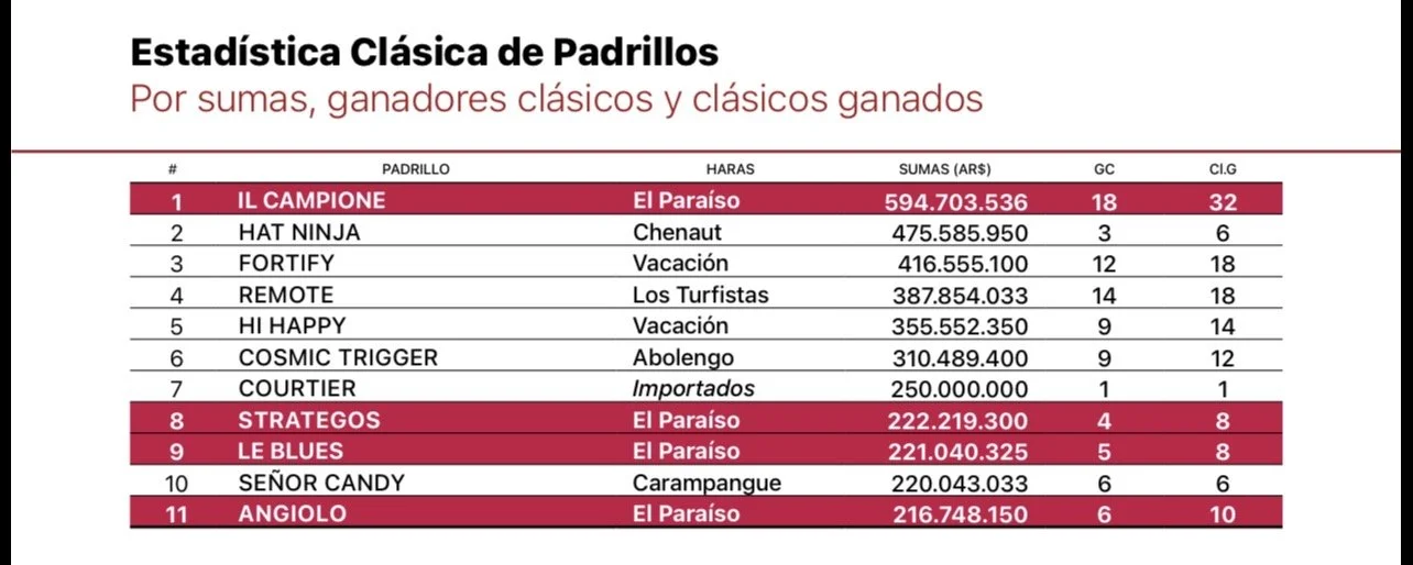 IL CAMPIONE 1# Estadística Clásica de Padrillos, por sumas ganadas, por hijos ganadores clasicos -18 -,por clasicos ganados -32-, y por G1 ganados -6-.