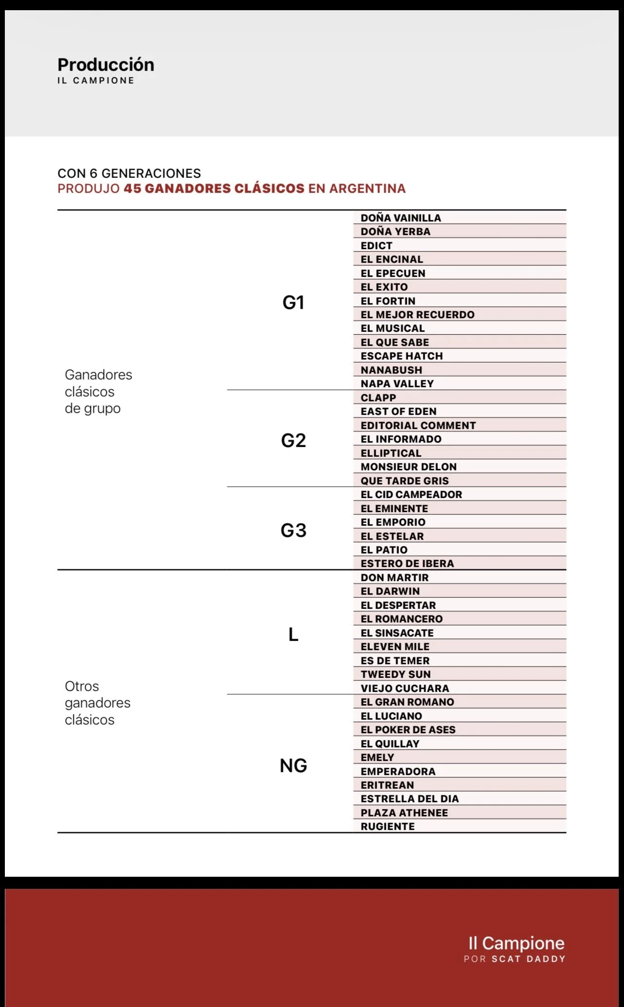 Con su primera producción nacida en 2018 en la Argentina, IL CAMPIONE es padre de 245 hijos Ganadores, 45 de ellos Ganadores Clásicos, 13 Ganadores de G1 incluso de: